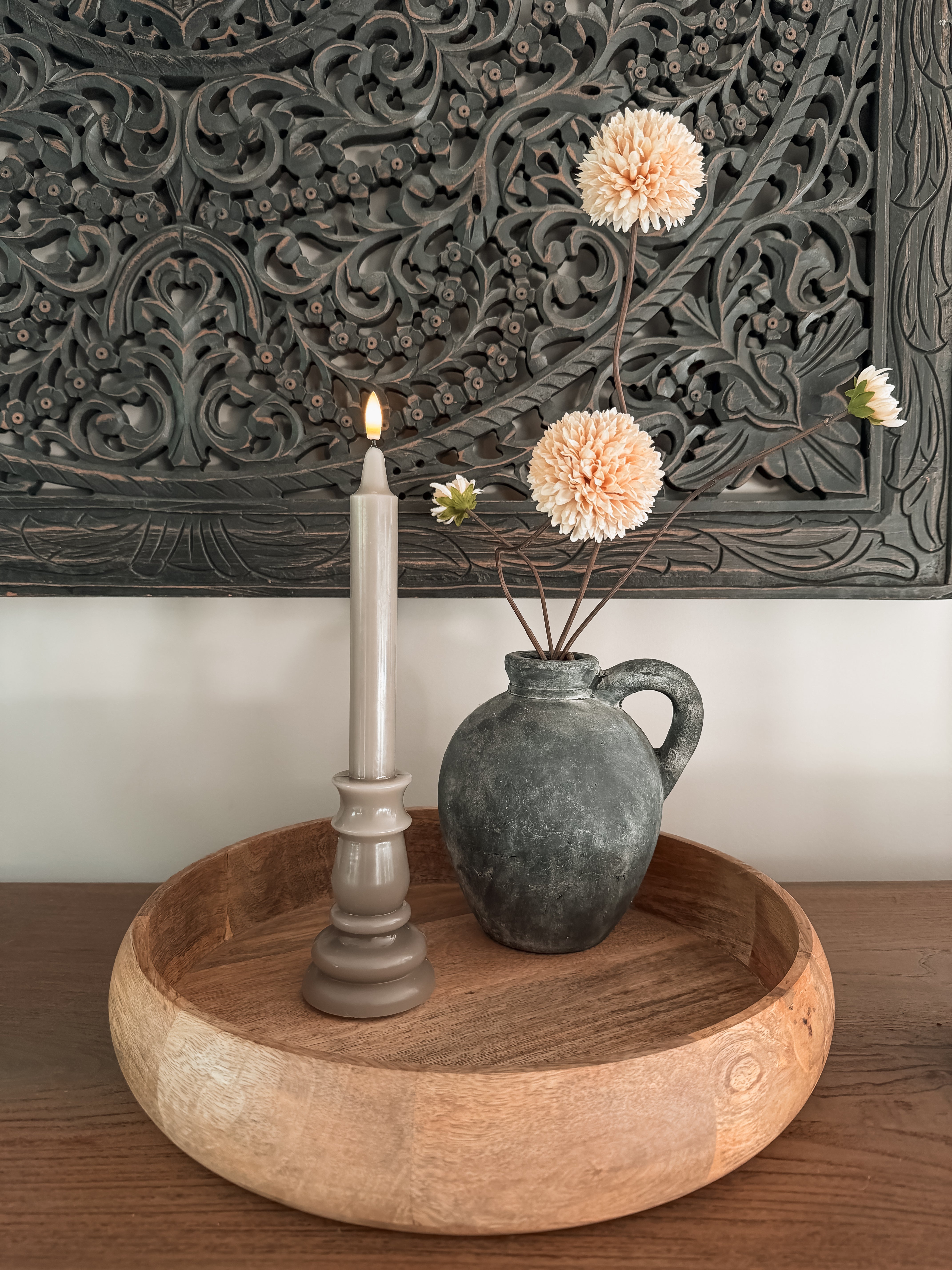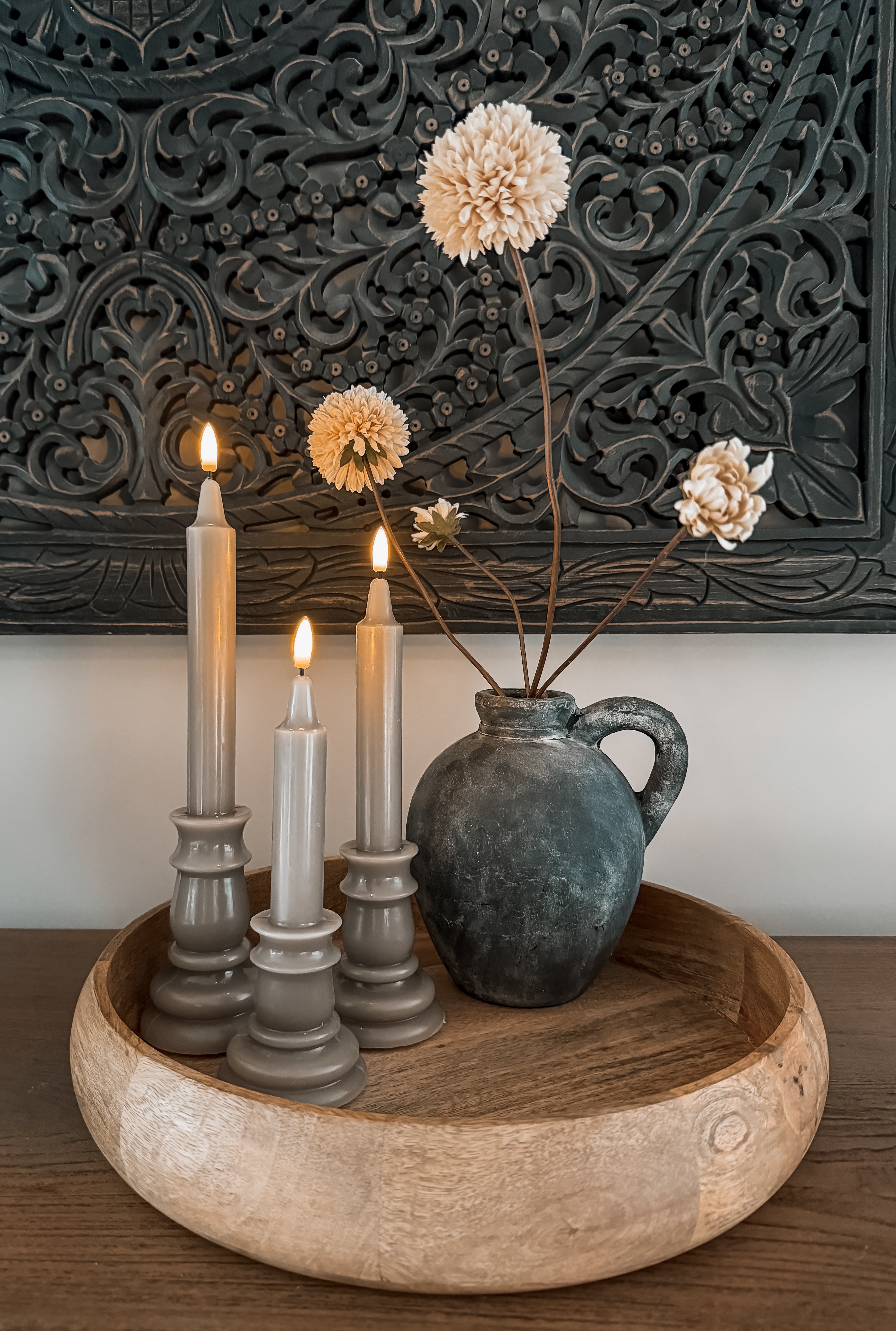 De kandelaar LED kaars is verkrijgbaar in 3 maten S-M-L en in onze twee kleuren beige en taupe.